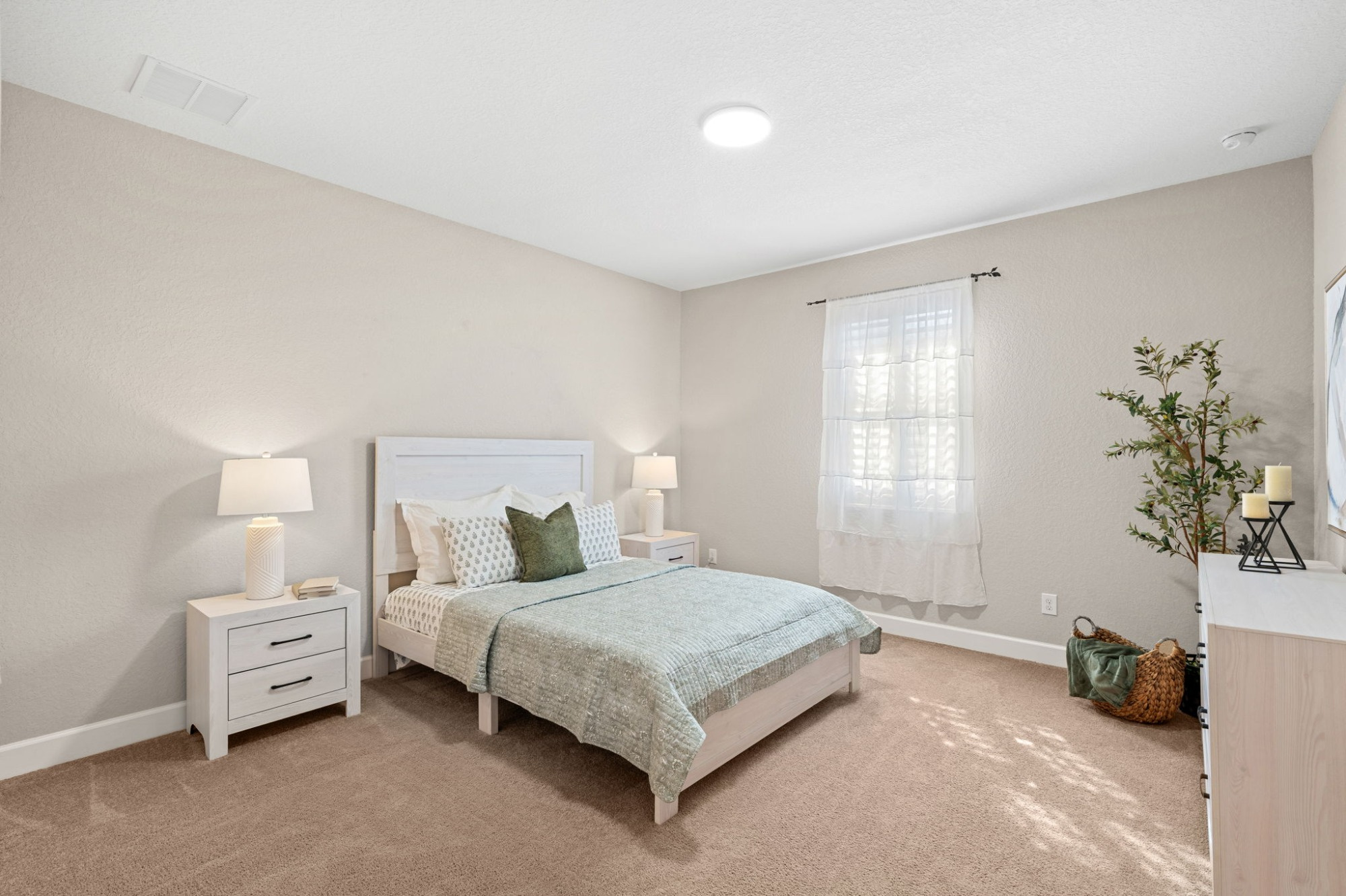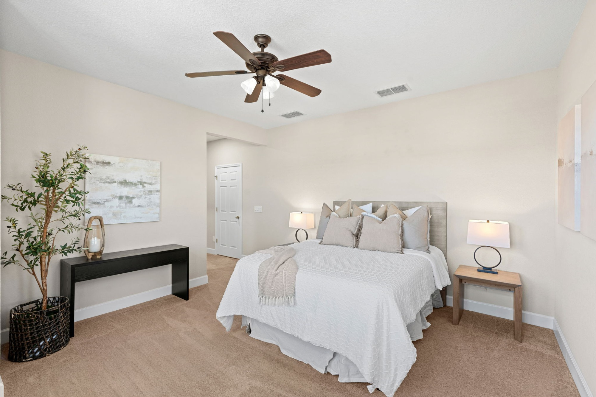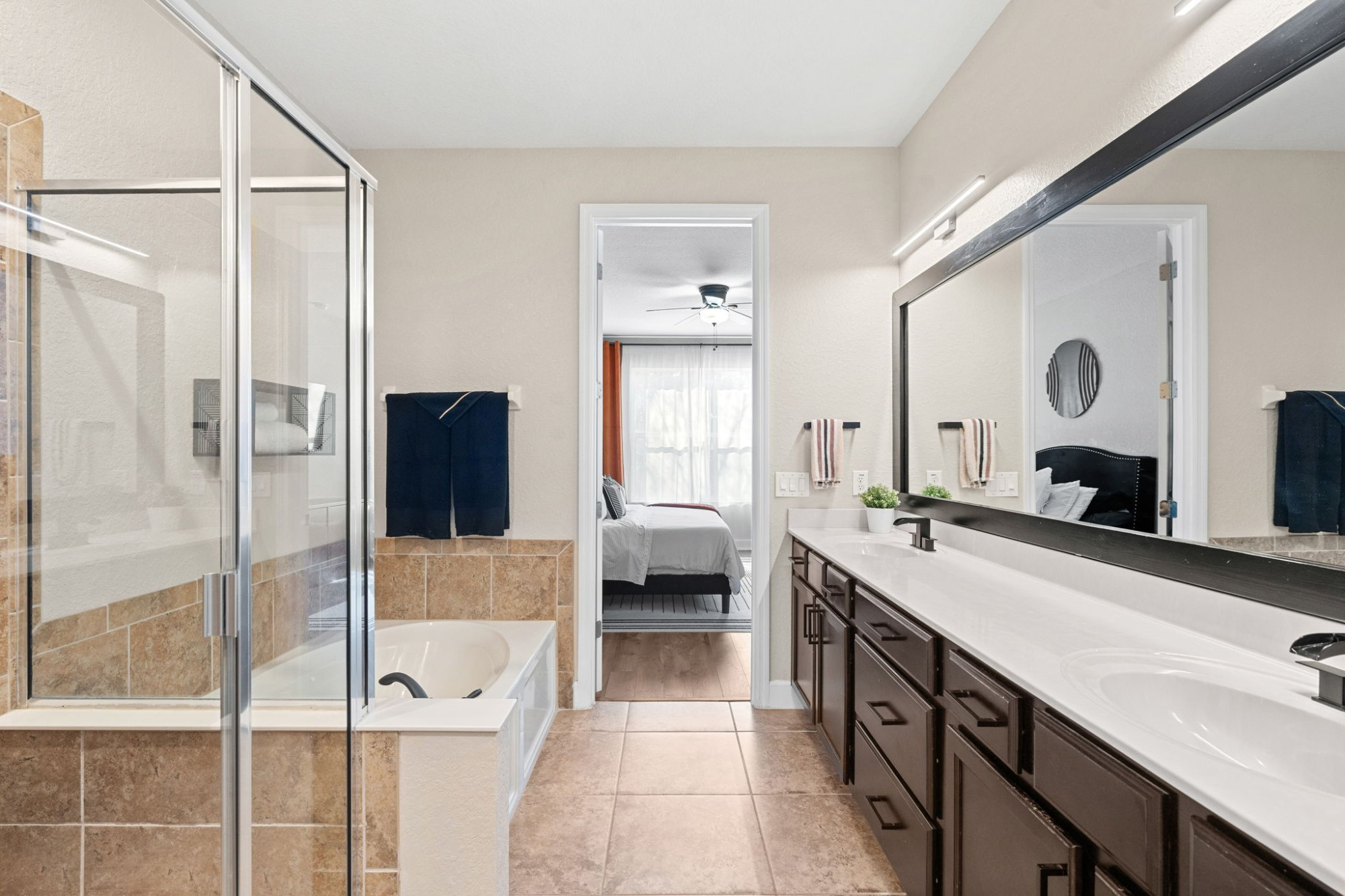 The first-floor primary suite offers comfort and privacy, complete with a spacious walk-in closet, dual vanities, a garden tub, and a separate walk-in shower—creating a true retreat at the end of the day. Upstairs, three additional bedrooms, a loft, and a dedicated tech center provide flexibility for guests, a home office, or growing households.