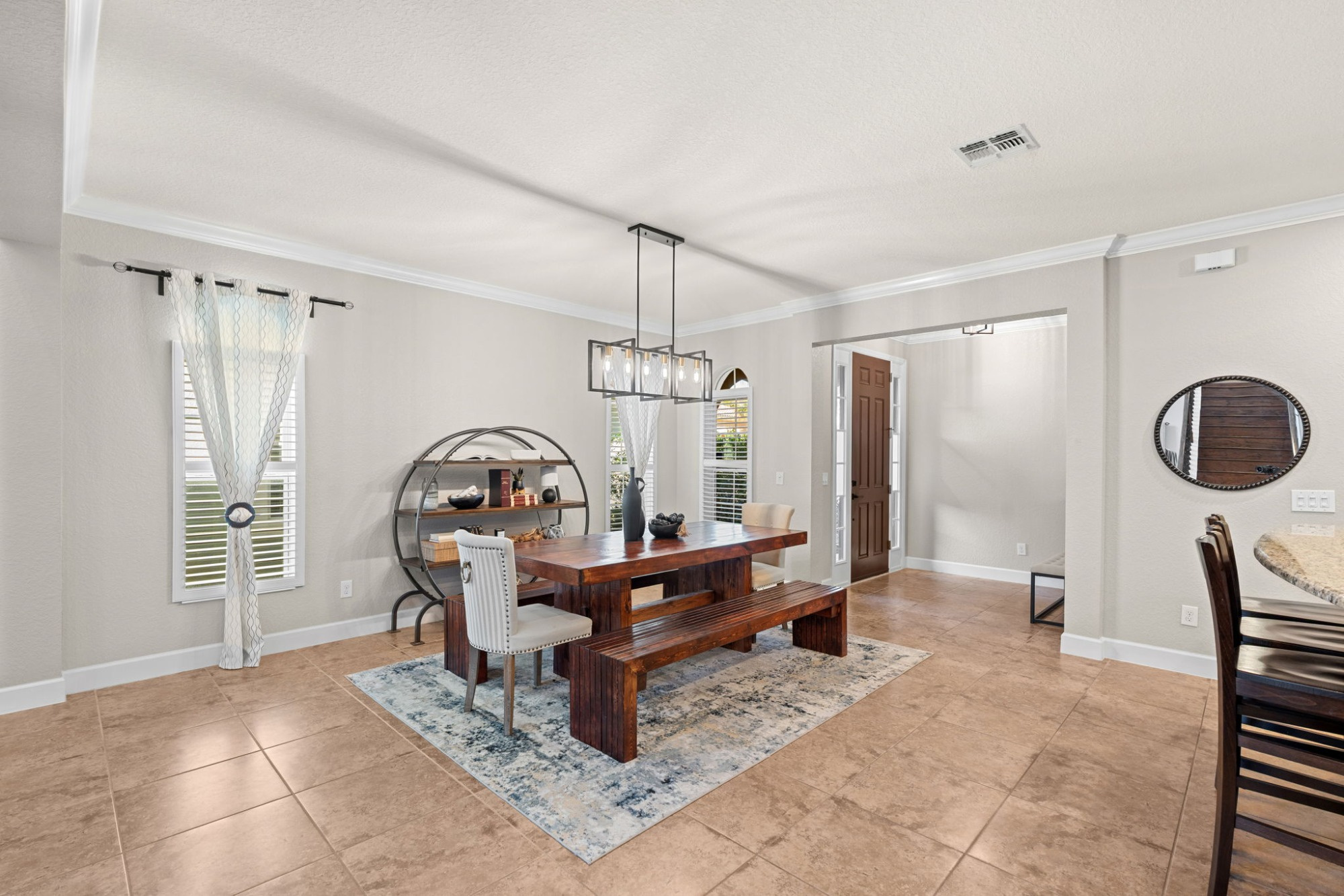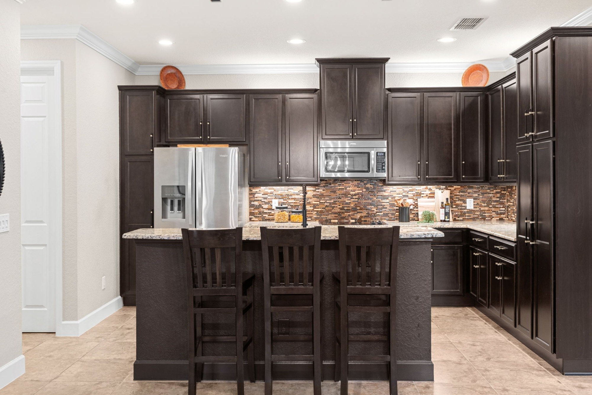 Inside, nearly 3,000 square feet of thoughtfully designed living space unfolds with tall ceilings, crown molding, plantation shutters, and an open-concept layout ideal for both everyday living and entertaining. The gourmet kitchen is the centerpiece of the home, featuring granite countertops, 42” cabinetry, stainless steel appliances, decorative backsplash, pull-out shelving, and a breakfast bar that seamlessly connects to the main living and dining areas.